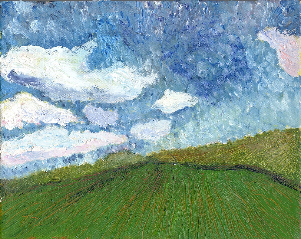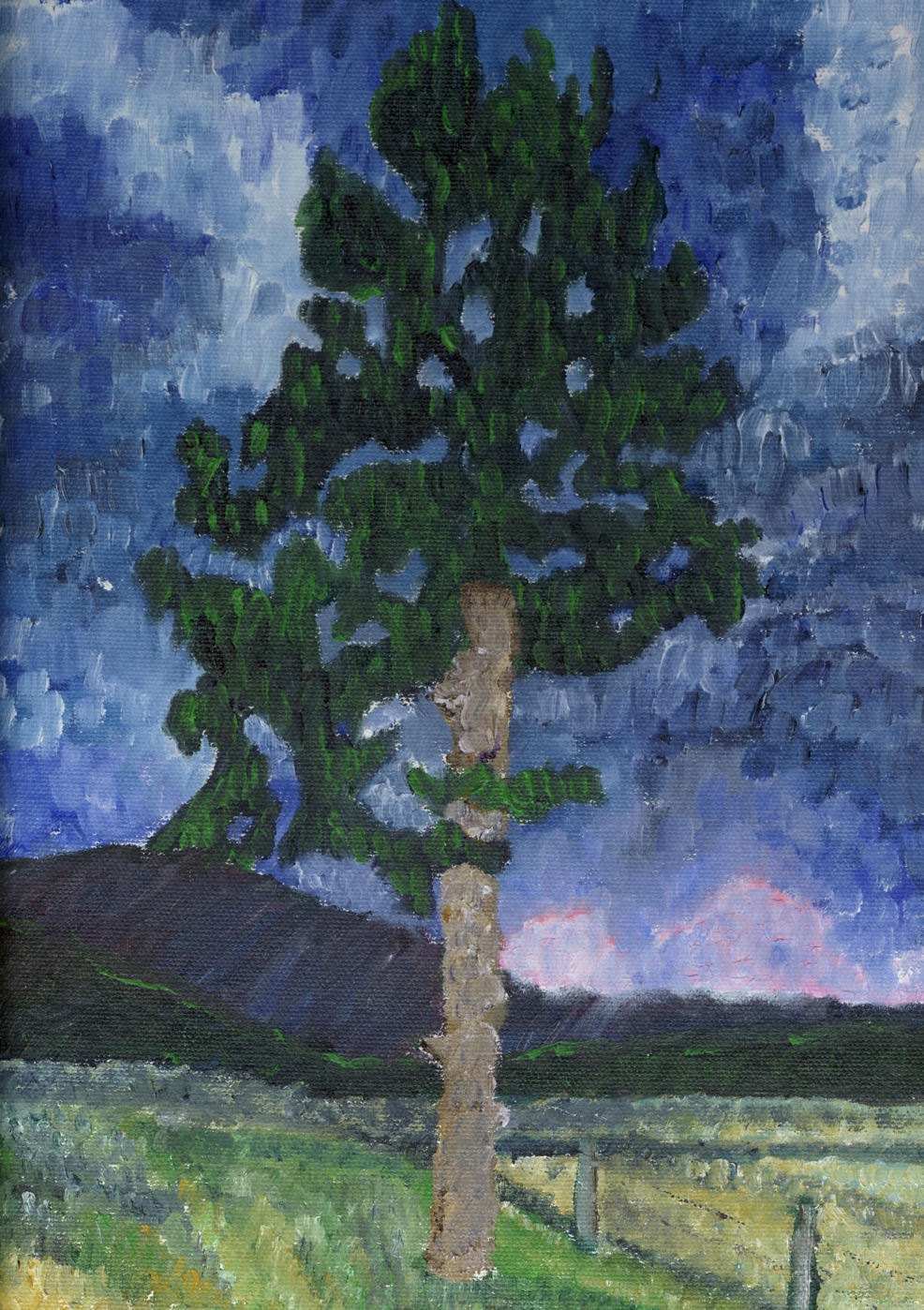 Oil painting of a tree next to a fence near the Caldera in the Jemez Mountains in New Mexico